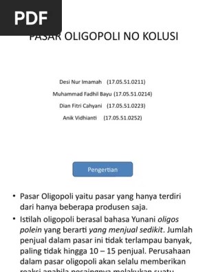 Berbeda dengan kolusi, oligopoli non kolusi yaitu jika terdapat produsen yang ingin memainkan harga, maka produsen tersebut . Pasar oligopoli adalah pasar di mana hanya ada segelintir pemain. Berikut ciri pasar oligopoli dan contoh pasar oligopoli. Pasar oligopoli non kolusi ini adalah pasar yang memungkinkan harga produk akan berubah dengan pertimbangan usaha kompetitor. Jenis pasar non kolusi adalah pada saat ada produsen yang memainkan harga, maka harus melihat perkembangan dari produsen lain yang menjadi kompetitor terlebih .