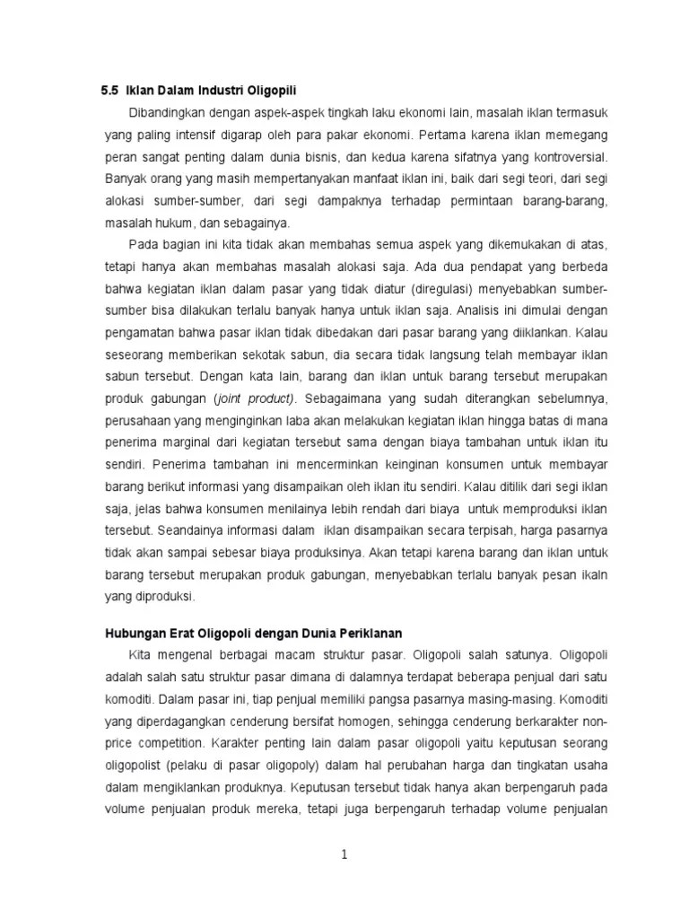 Dan apa sebenarnya fungsi iklan dalam pasar oligopoli? 5 iklan dalam industri oligopili. Karena pada pasar oligopoli menghasilkan barang diferensiasi , sehingga perusahaan melakukan promosi melalui iklan agar masyarakat bisa mengetahu produk . Sehingga di dalam sistem pasar ini tidak ada satupun perusahaan yang dapat bertindak secara bebas. Ilustrasi periklanan dalam pasar oligopoli credit: Karena dengan diadakan iklan sehingga menjadi lebih menarik dan dapat meningkatkan minat seseorang. Dilihat dari produk yang diperdagangkan maka dalam pasar . Pada umumnya perusahaan oligopoli perlu melakukan promosi secara iklan. Halo mumuh s, kakak bantu jawab ya. Terdapat beberapa penjual · 2. Barang yang dijual homogen atau . Peran sangat penting dalam dunia bisnis, dan kedua karena sifatnya yang kontroversial. Karena iklan berfungsi mereduksi biaya yang harus dikeluarkan konsumen dalam rangka memperoleh .
