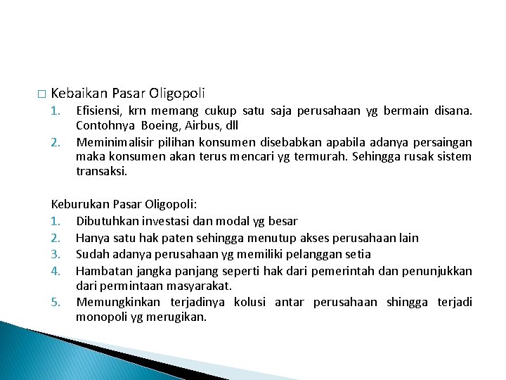 Dalam pasar monopoli, perusahaan menghasilkan barang yang tidak memiliki barang pengganti dari produsen lain. Persaingan antar penjual atau produsen dapat menguntungkan konsumen. 12/02/2022 · pasar oligopoli oleh pak alex diposting pada februari 12, 2022 pada kesempatan kali ini pengajar.co.id akan membuat artikel yang berjudul pasar oligopoli: Pengembangan produk diimbangi oleh kemajuan iptek. Dapat menyebabkan terjadinya perang harga, hal ini dikarenakan persaingan antar penjual di. 06/12/2021 · kelebihan dan kekurangan pasar oligopoli kelebihan pasar oligopoli konsumen dapat memilih barang yang ingin dikonsumsinya persaingan antar produsen dapat memberikan keuntungan bagi konsumen, karena akan terjadi peningkatan kualitas barang produksi sehingga memuaskan kebutuhan konsumen. Produk yang terus berkembang karena untuk meningkatkan persaingan antar produsen. 20/06/2000 · keburukan pasar oligopoli bagi produsen dapat menciptakan ketidakseimbangan pendapatan antar perusahaan. 27/06/2021 · keburukan pasar oligopoli pasar oligopoli akan banyak berdampak negatif bagi konsumen kalau diantara oligopolis melakukan kerja sama. Bisa terjadi sebuah perusahaan mencetak keuntungan tinggi disaat yang sama perusahaan lain mengalami kerugian. Pembeli tidak bisa seenaknya menekan penjual karena … 14/06/2018 · kebaikan dan keburukan pasar oligopoli untuk masuk ke dalam pasar oligopoli memang sangat diperlukan modal yang sangat tinggi dan disertai dengan kemampuan manajerial yang juga sangat tinggi. Dampak oligopoli dengan kerja sama hampir sama dengan dampak monopoli, hanya kadarnya …