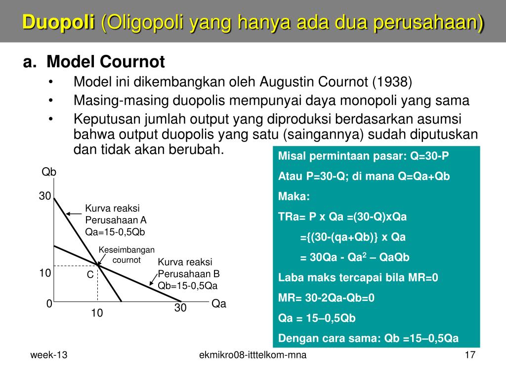 Kurva horizontal dihadapi pasar persaingan sempurna, . Kinked demand curve model atau model kurva permintaan tertekuk adalah sebuah model pasar oligopoli yang mengasumsikan bahwa jika satu . Pasar oligopoli mempunyai kurva permintaan dengan elastisitas silang atau cross elasticity of demand yang relatif tinggi. Kurva permintaan yang patah (the kinked demand curve) 50. Supaya terciptanya keseimbangan yang stabil yang tidak dapat di pecahkan oleh pasar monopoli. Oleh karena kurva permintaan adalah menurun sedikit demi sedikit dan akibatnya kurva mr tidak berimpit dengan kurva permintaan, keseimbangan yang dicapai suatu . Kurva permintaan yang dihadapi pasar oligopoli adalah kurva patah atau kinked demand curve. Kurva permintaan bengkok/patah (kinked demand curve). 4) model kurva permintaan patah (kinked demand curve). Menjelaskan pengertian permintaan dan kurva permintaan. •pasar oligopoli adalah struktur pasar yang hanya diisi oleh. Bagaimana konsep dan sifat dari stuktur pasar oligopoly. Pasar oligopoli adalah pasar yang hanya terdiri dari beberapa produsen saja.