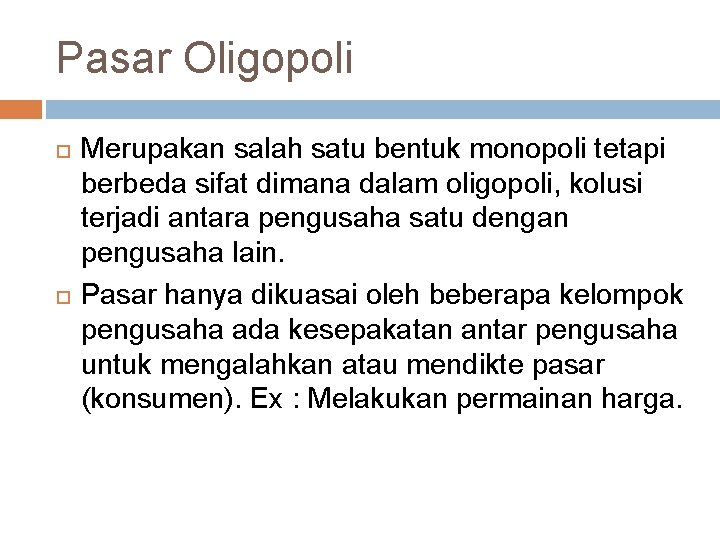 Meski begitu, kedua bentuk pasar persaingan tidak sempurna ini tetap memiliki perbedaan. Tapi, yang menjadi ciri utama dari oligopoli adalah produksi barang dalam … 06/01/2012 · pengertian monopoli dan oligopoli secara etimologi, kata “monopoli” berasal dari kata yunani ‘monos’ yang berarti sendiri dan ‘polein’ yang berarti penjual. Perbedaan pasar monopoli dan oligopoli yang paling mendasar adalah dari seberapa banyak perusahaan yang menjual produk yang sama. Pasar dengan banyak penjual dan pembeli sehingga harga dapat ditentukan sendiri, baik oleh penjual maupun pembeli.