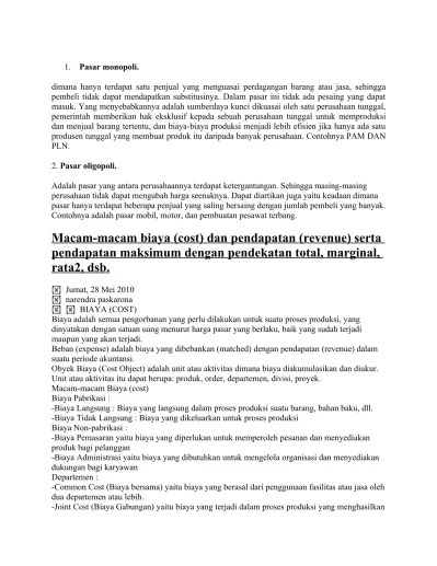 12/01/2012 · pasar oligopoli dengan pembedaan (differentiated oligopoly) • pasar ini merupakan suatu bentuk praktek oligopoli dimana barang yang diperdagangkan dapat dibedakan, misalnya pasar sepeda motor di indonesia yang dikuasai oleh beberapa merek terkenal seperti honda, yamaha dan suzuki.